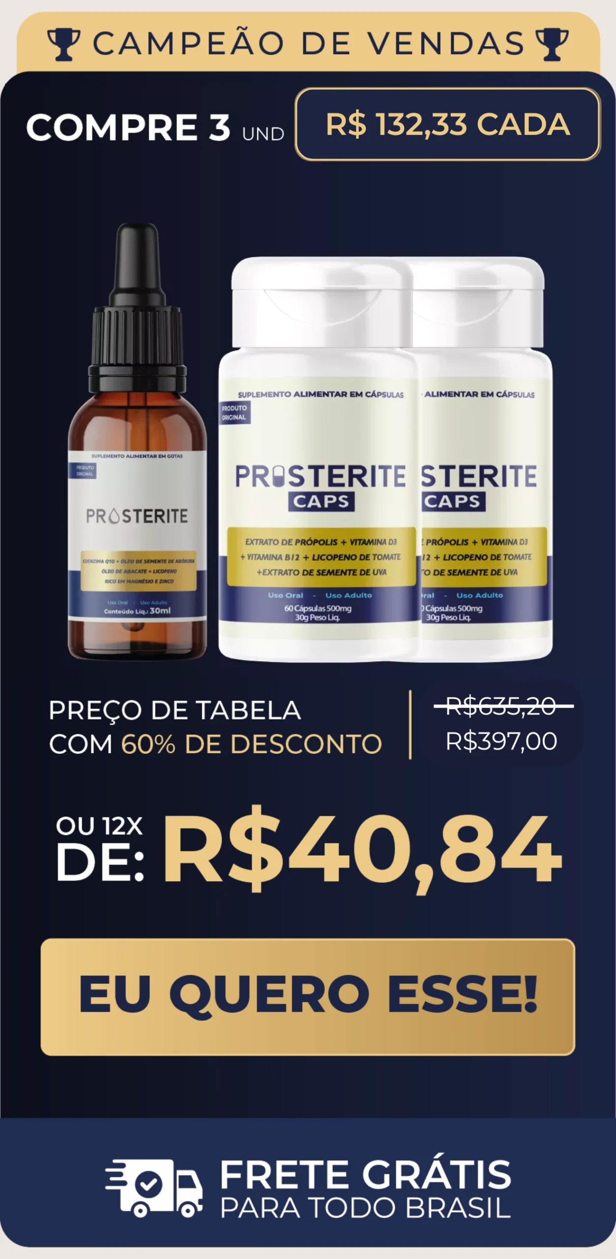 Temos total confiança na qualidade do PROSTERITE. Se, por algum motivo, você não estiver satisfeito com o produto, poderá exercer o seu direito de arrependimento em até 30 dias após a compra e ter seu dinheiro de volta, mesmo que já tenha utilizado todo o produto.